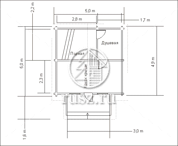 Конструкция: Баня состоит из крыльца, одной комнаты, душевой и парной, общ. пл. 22,7 кв.м. Собрана из бруса хвойных пород 100x150 мм с выпусками по углам - 100 мм с перестилкой растительным мхом или Паклей. Наружная часть стены оструганный брус. Внутренние стены оструганный брус (парная обшита фольгой и осиновой вагонкой). Высота потолков в парной 2,1 м. Толщина стен 92 мм. Потолок утеплен минватой. Крыша двухскатная с чердачным помещением. Высота конька крыши от потолка 1,5 м. Выпуск крыши - 50 см. Кровля - гофролист стальной оцинкованный. Пол - двойной, утепленный (черновой + половая доска 36 мм). Окна одностворчатые двухрамные на петлях. В комплект поставки входят фундаментные блоки 20x20x40 в количестве 42 шт. и необходимая монтажная арматура.