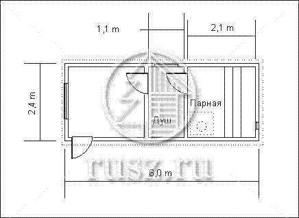 Конструкция: Баня состоит из одной комнаты, душевой и парной. общ. пл. 13,8 кв.м. Собрана из бруса хвойных пород 100x150 мм с перестилкой растительным мхом или паклей. Наружная часть стены оструганный брус. Внутренние стены оструганный брус (парная обшита осиновой вагонкой). Высота потолков в парной 2,1 м. Толщина стен 92 мм. Потолок утеплен минватой. Крыша двухскатная или односкатная без чердачного помещения. Высота конька крыши от потолка 15 см. Выпуск крыши 10 -15 см. Кровля - лист стальной оцинкованный. Пол - двойной (черновой - необрезная доска, чистовой - половая доска 32-38 мм). Окна двухстворчатое и одностворчатые двухрамные на петлях. Имеются полозья для транспортировки по территории. В комплект поставки входят фундаментные блоки 20x20x40 см в количестве 6 шт.