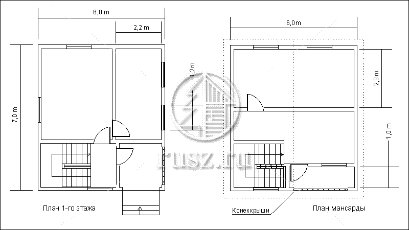 Высота 1-го этажа – 2,3 м. Высота мансардного этажа – 2,2 м. |