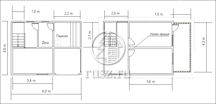 Конструкция: Баня состоит из двух этажей. Первый этаж - закрытое крыльцо, две комнаты, душевая и парная. Второй этаж - три комнаты и балкон. общ. пл. 55,2 кв.м. Первый этаж собран из бруса хвойных пород 100x150 мм с перестилкой растительным мхом или паклей. Наружная часть стены оструганный брус. Внутренние стены оструганный брус (парная обшита фольгой и осиновой вагонкой). Высота потолков в парной 2,3 м. Толщина стен 92 мм. Потолок утеплен минватой. Основа второго этажа - деревянный каркас, выполненный из бруска 50х50 мм. Стены и потолок обшиты вагонкой (снаружи - горизонтально, внутри вертикально). Толщина стен 100-120 мм. Стены и потолок утеплены минватой. Крыша двухскатная с чердачным помещением. Высота конька крыши от потолка 1,0 м. Выпуск крыши - 50 см. Кровля - лист стальной оцинкованный. Пол - двойной (черновой - необрезная доска, чистовой - половая доска 32-38 мм). Окна двухстворчатые и одностворчатые двухрамные на петлях. Наружная дверь филенчатая, внутренние каркасные, обшитые вагонкой с двух сторон. Дверь в парную со стороны парной обшита осиновой вагонкой. В комплект поставки входят фундаментные блоки 20x20x40 мм в количестве 48 шт. и необходимая монтажная арматура.